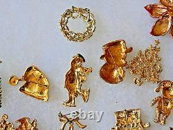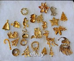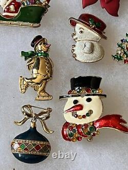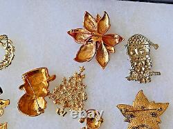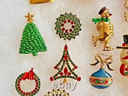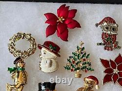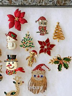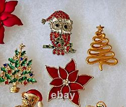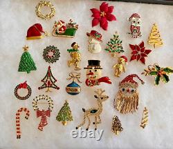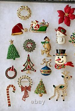 25 mostly vintage Christmas pins lot... There are some trees, Santa, wreaths, frosty, reindeer, Pointsettas, ornaments etc... I didn't see any stones missing, but one or two have some not so vibrant stones. Please look at all the photos. I LOOK EVERY PIECE OVER AND DO MY VERY BEST TO TRY AND DESCRIBE EVERY PIECE ACCURATELY...