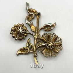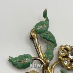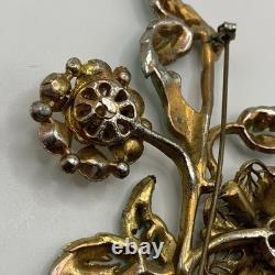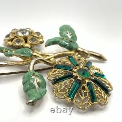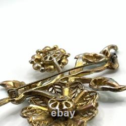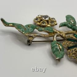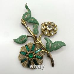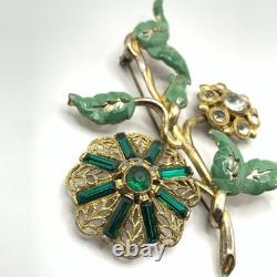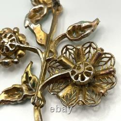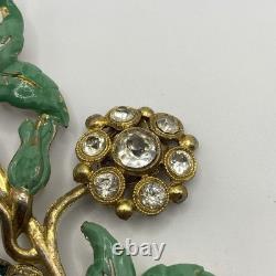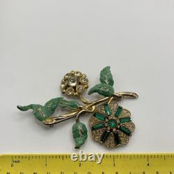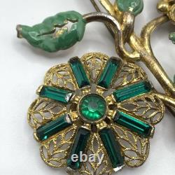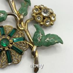 Antique 1920s 30s Pot Metal Gold Wash Green Enamel Green clear Rhinestone Brooch. Good condition for its age with some gold loss as seen in photos.