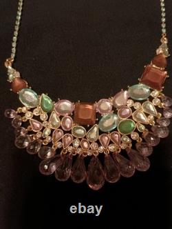Arnold Scaasi Vintage Asymmetrical Multicolor Pendant Brooch Bib Necklace is a stunning piece of fashion jewelry from the early 2000s. This statement necklace features a unique asymmetrical pendant design with a lobster closure, signed by the brand. The multicolor rhinestone main stone adds a touch of beauty and glamour to the piece, making it a standout accessory for any outfit.