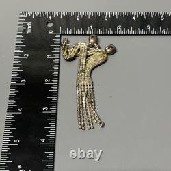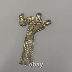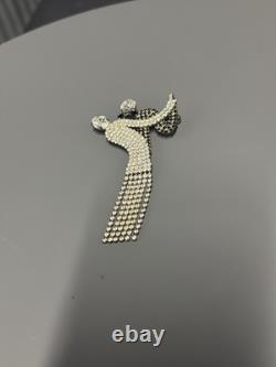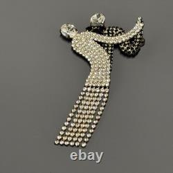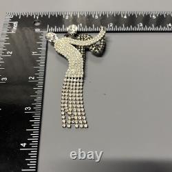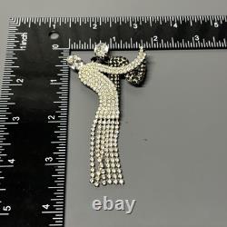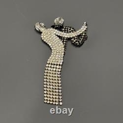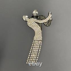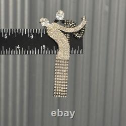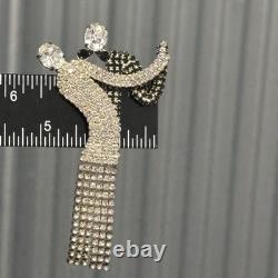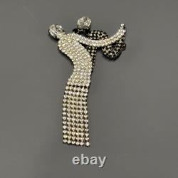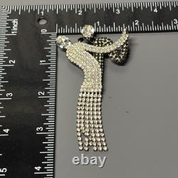 Elegant dancer/ballerina design with flowing dress and articulated rhinestone fringe. Large brooch measures approximately 4 inches long. Features two large rhinestones at the head and arm.
