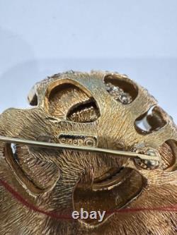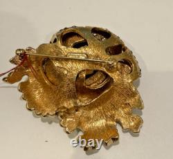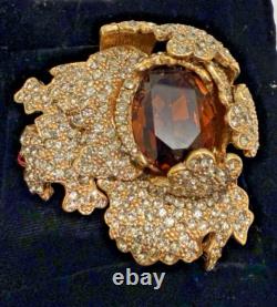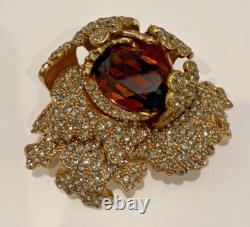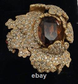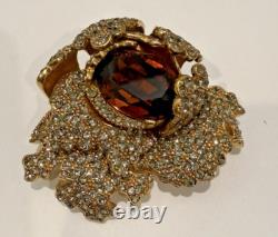 SIGNED CINER BROOCH IS GOLD PLATED METAL WITH A LARGE COGNAC TOPAZ BROWN CRYSTAL GLASS STONE DNAD PAVE SMOKEY GREY STONES.