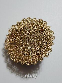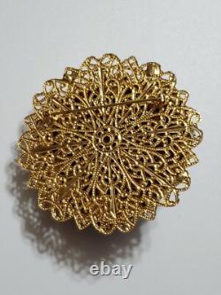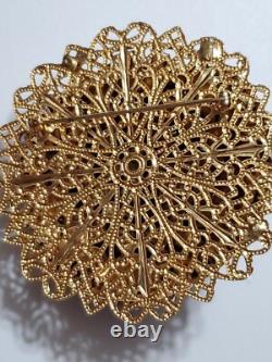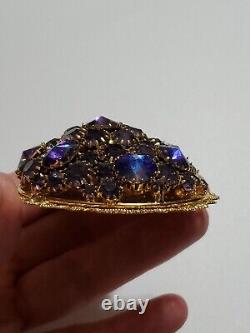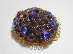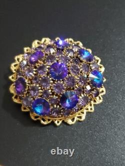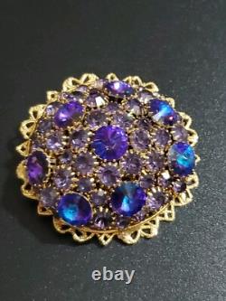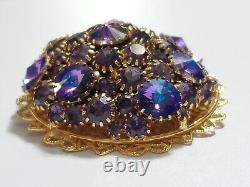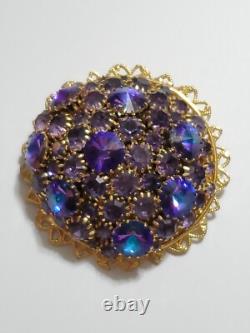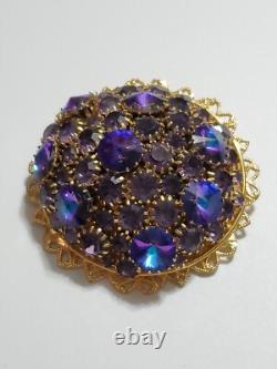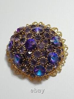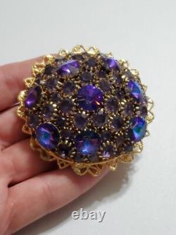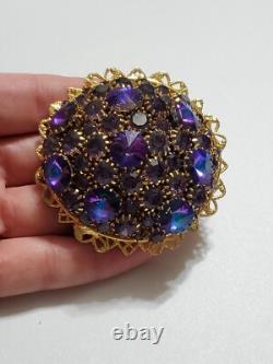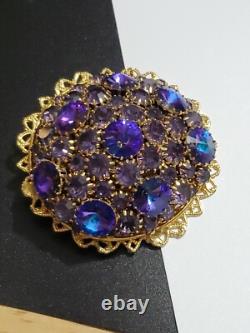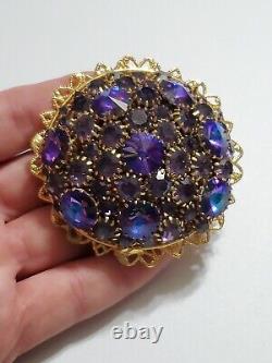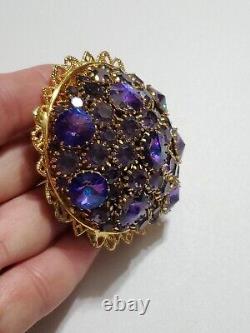 Believe this pin is Austria or West Germany Christian Dior era. It is very large, stacked high, with purple blue rivoli and purple rhinestones, nice prongs, gold tone filigree metal, no signature, stunning stand out piece.