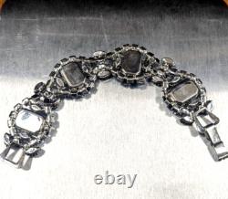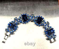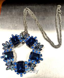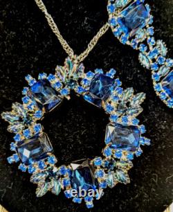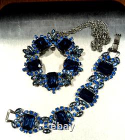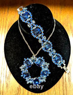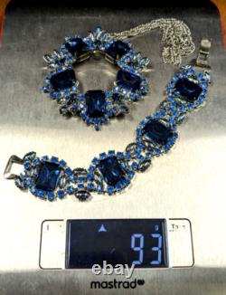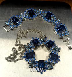 We are offering a unique one of a kind vintage blue rhinestone brooch by Juliana which has been transformed into a charming necklace and includes a beautiful matching bracelet, featuring blue rhinestones. This handmade vintage set weighs 93 grams. The pin/clasp on the back of the brooch was broken so it was removed entirely and made into a necklace.