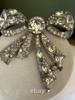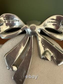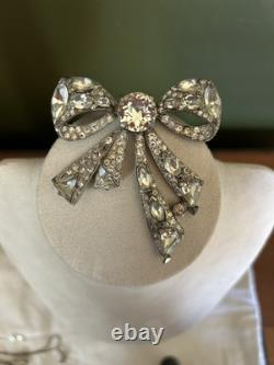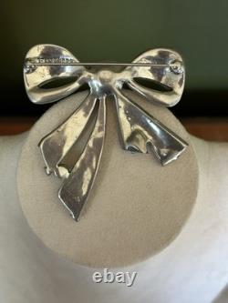 This Rare Eisenberg Original Stunning Bow Pin in Silver with Shaped Rhinestones is a vintage piece from the 1940s, making it a unique and timeless accessory. The intricate design features a bow shape with white/colorless crystal rhinestones set in sterling silver, showcasing the brand's signature prong setting style. Perfect for special occasions like Mother's Day, engagements, weddings, and anniversaries, this original brooch exudes beauty and elegance, embodying the retro era of fashion design. Made in the United States, this stunning piece is a treasure for any woman's jewelry collection.