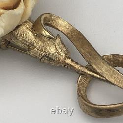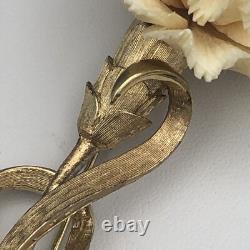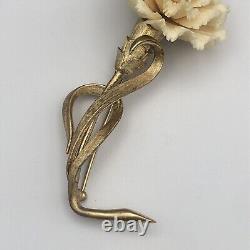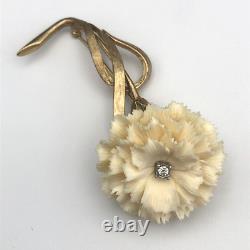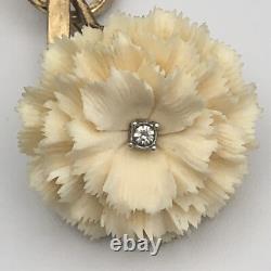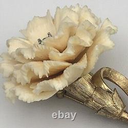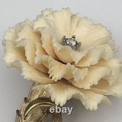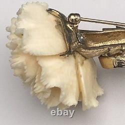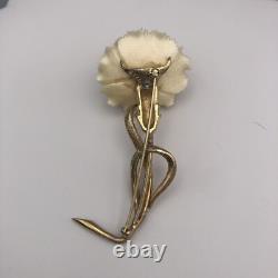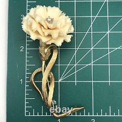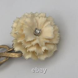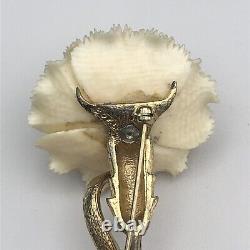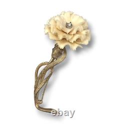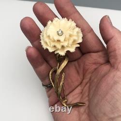 Rare Vintage Marcel Boucher Carved Carnation Large Flower Pin Brooch Rhinestone. In good condition with light wear consistent with age. Back of pin shows light discoloratoin where the pin is connected to the carved flower. Please refer to pictures for details as they are also part of the description. This exquisite brooch features a beautifully detailed carnation motif, combining the elegance of carved bone with the sophistication of metal.