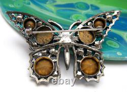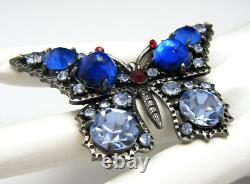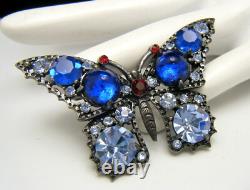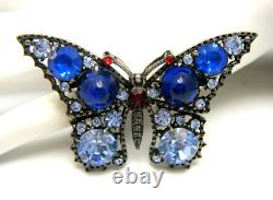 Rare Vintage Rhinestone Butterfly Brooch Blue Bullet Cabochons Red Accents Silver Tone. Brooch Measures 1 1/2" Tall and 2 1/2" Wide Approximately. Condition is Very Good with Light Wear and Aging to the Foil Backs of the Stones that Does Not Detract.