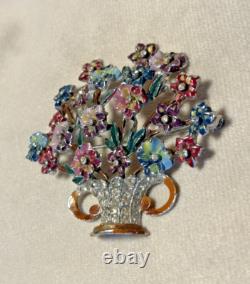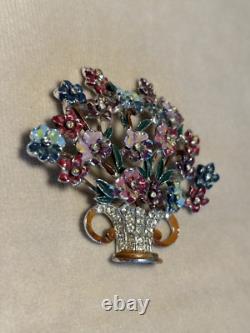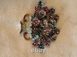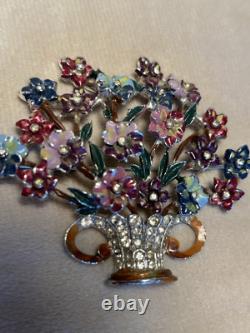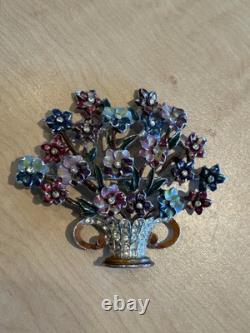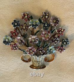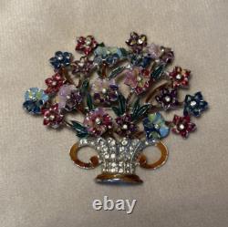 Offering a fabulous signed Coro vintage brooch. The flower basket or bouquet is loaded with lovely dimensional enamel flowers with a tiny rhinestone at the center. The multi-color enamel is in very nice vintage condition with minimal loss appropriate for age.