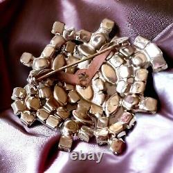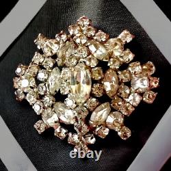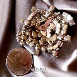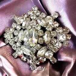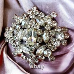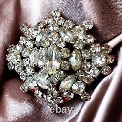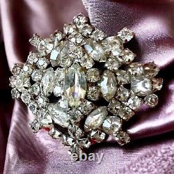 This captivating vintage brooch features a mesmerizing domed design set with sparkling clear rhinestones. The geometric pattern exudes early mid-century flair, reminiscent of the Art Deco era. Unsigned, the piece evokes the craftsmanship of renowned designers like Weiss or Trifari. In excellent condition, the brooch measures approximately 2 inches in diameter and makes a dazzling and iconic statement. Maker: Unsigned, reminiscent of Art era designers like Weiss or Trifari.