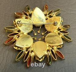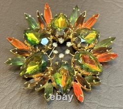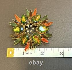 This UNSIGNED BEAUTY VTG Orange Watermelon Green Dog Tooth Prongs Rhinestone Brooch is a vintage accessory featuring a round shape with green and orange rhinestones set in gold tone metal. This vintage brooch is perfect for all occasions, embodying a retro era aesthetic from the 1950s-60s. Made in the United States, this original piece adds a touch of vintage charm to any outfit, making it a unique and eye-catching addition to any jewelry collection. The brooch is in overall excellent condition, aside from one rhinestone having a scratch. This is pictured in the second to last photo.