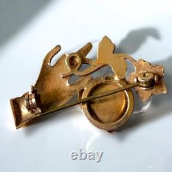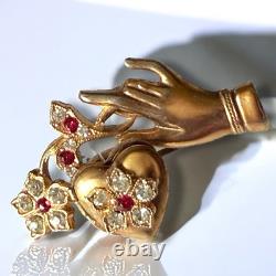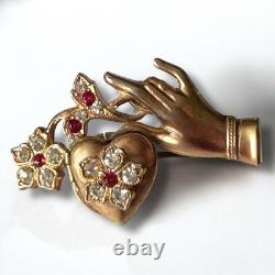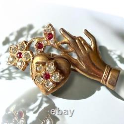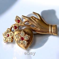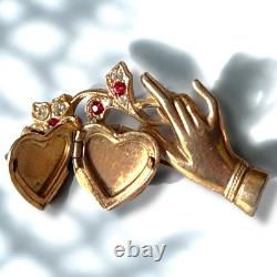 Brilliant clear rhinestones shimmer alongside fiery ruby red accents, adding a touch of opulence to this soulful design. Every detail speaks of affection: the hand symbolizes loyalty, the heart eternal love, and the blossoming flowers the flourishing of devotion through time. This piece echoes the sentimental jewelry traditions of the late 19th century, when tokens of affection were lovingly exchanged between sweethearts and family members. The early tube hinge and simple C-clasp further affirm its authenticity as a faithful Victorian Revival treasure, likely created between the 1920s and 1930s when the romantic spirit of the Victorian age saw a resurgence in jewelry artistry. A locket brooch of this detail and symbolism is a rare find, a keepsake to wear close to your heart or gift to someone whose memory deserves a place of honor.
