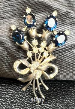 This vintage Trifari brooch from the 1940s features a stunning floral bouquet design crafted by renowned designer Alfred Philippe. Made of sterling silver with a prong setting, the brooch is adorned with blue rhinestones in an oval shape. Signed by the designer, this exquisite piece showcases excellent craftsmanship typical of the Retro era. A stylish and elegant accessory for women, this authentic Trifari brooch is a collector's item with a touch of glamour from a bygone era.