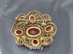 Vintage Art Deco Czech Red Glass Rhinestone Gold tone Brooch. 2 1/4 x 2 in size.