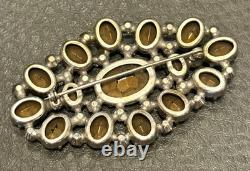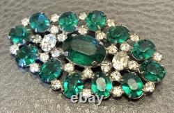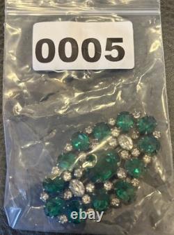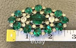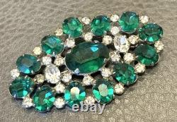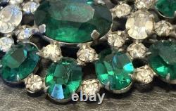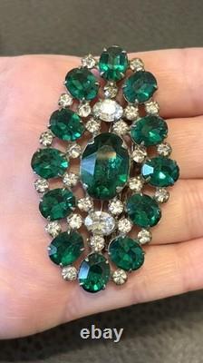 This vintage Art Deco brooch features large green and clear rhinestones in a silver tone setting, exuding high-end quality. The prong setting style adds a touch of elegance to this unique piece, perfect for all occasions. Made with mixed materials, this original piece from the Art Deco era is a must-have for any fashion-forward woman looking to add a touch of vintage charm to their ensemble. The brooch's size and design make it a standout accessory that is sure to turn heads.