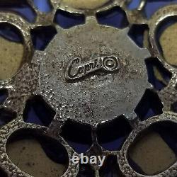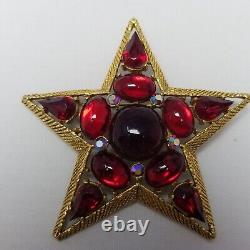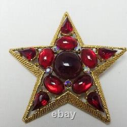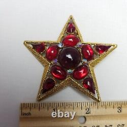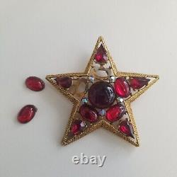 Vintage Capri Red Cabochon Rhinestone Five Pointed Star Brooch, Gold Tone. Two of the stones needs to be reglued. Repair left for next owner Shows some wear.