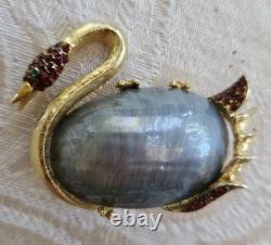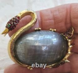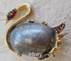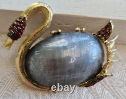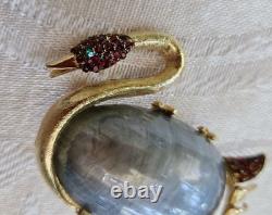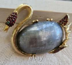 VINTAGE CORO JELLY BELLY SWAN BROOCH PIN AS PICTURED. AN ALFRED KATZ DESIGN WIITH A BRUSHED GOLDTONE BASE ACCENTED WITH RED RHINESTONES AND GREEN EYES, JELLY BELLY. PIN MEASURES ABOUT 2 INCHES IN LENGTH. PLEASE EXAMINE ALL PHOTOS AS THEY PROVIDE THE BEST DESCRIPTION AND CONTACT ME WITH QUESTIONS.