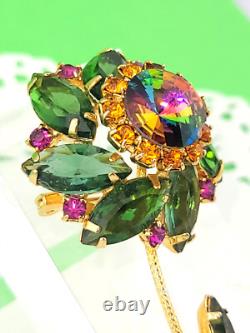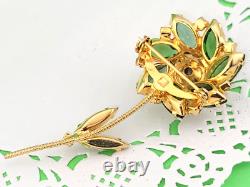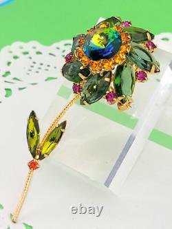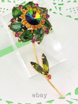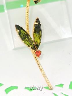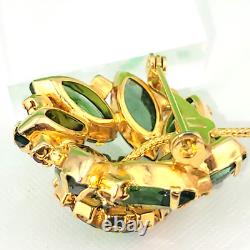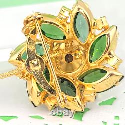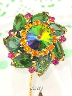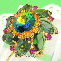Vintage D&E Watermelon Rivoli Green Pink Rhinestone Flower Brooch 3 Gold Plated
