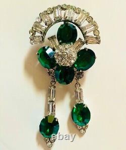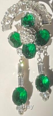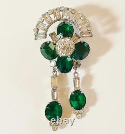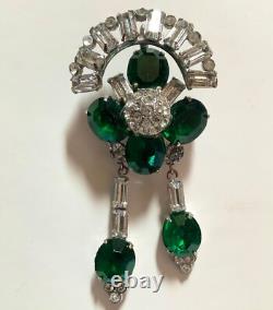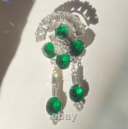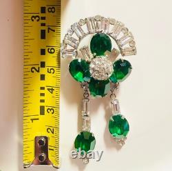 Elevate your accessory game with this vintage faux emerald and rhinestone pendant pin brooch. A striking piece measuring an impressive 3 inches, it oscillates between a chic asymmetrical shape and a dazzling display of oval-cut glass stones set in a prong and paste setting. The green and clear color palette exudes a timeless elegance, while its versatility ensures a perfect fit for any outfit.