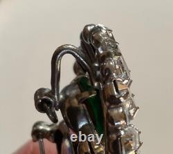 Measures 3" long and 1.5" wide. One small rhinestone has been re-glued. The pin securely and safely clasps with no issues, whatsoever.Photos taken in direct sun and no sun environment to show variation in the brilliancy of the faux emeralds.