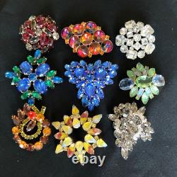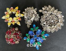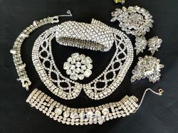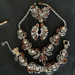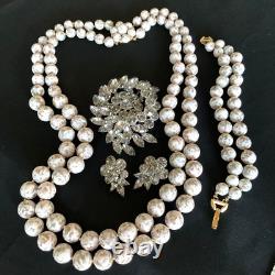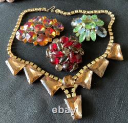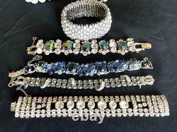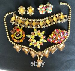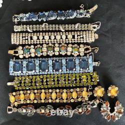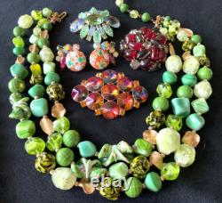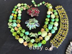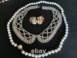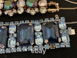 WEISS smokey gray ribbon brooch. JULIANA Easter egg earrings, book piece. JULIANA 5 link bracelet, VERIFIED. CROWN TRIFARI 2 strand necklace, bracelet set. MIRIAM HASKELL white milk glass necklace. HATTIE CARNEGIE green 3 strand necklace. Green brooch has inverted stones, schreiner? Review all pictures closely for description and details, they show condition of jewelry so there will be no issue, you decide on condition for yourself, Pictures are most of the description. Large blue bracelet is missing one stone as shown in picture. All jewelry in working order.