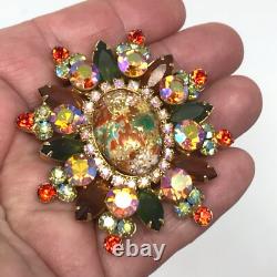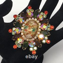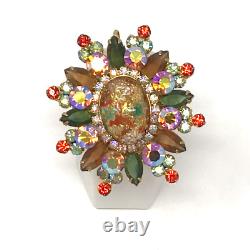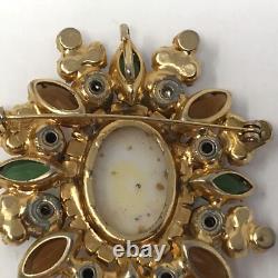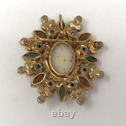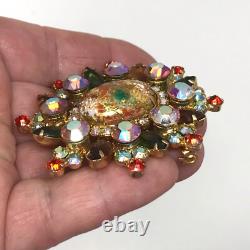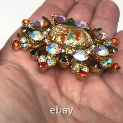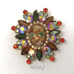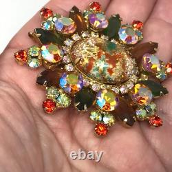 Verified DeLizza and Elster Juliana Easter egg brooch. Features sparkling rhinestones in autumn tones with both a pin back and a bail so you can wear as either a brooch or a pendant. In very good condition with no missing or dark rhinestones. There is slight wear to the plating on the back of the brooch. Measures approximately 2.25"x2.125".