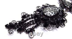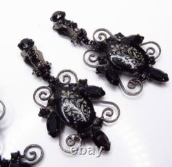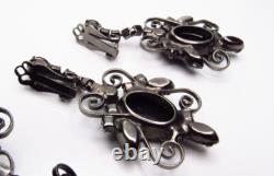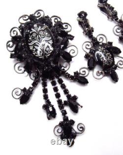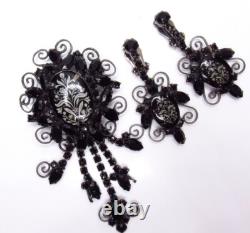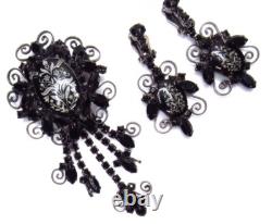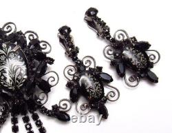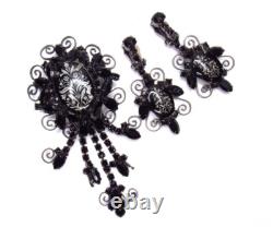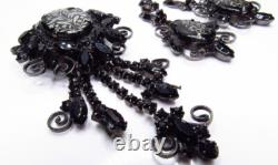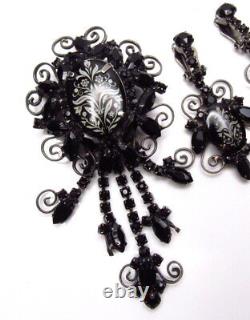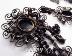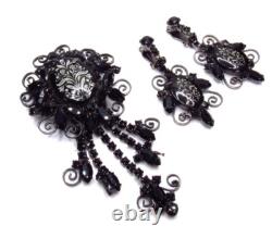 Please note on brooch, two of the scrolls on the drops are missing. 3.75 inches drop clip earrings approx.