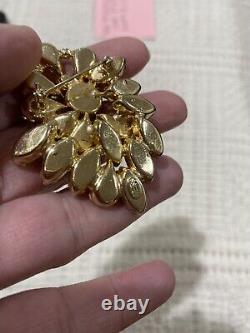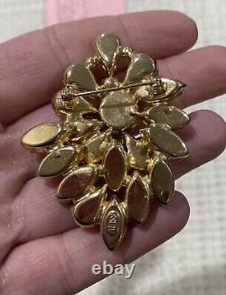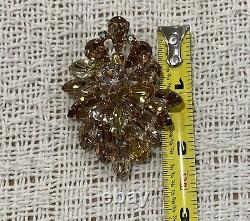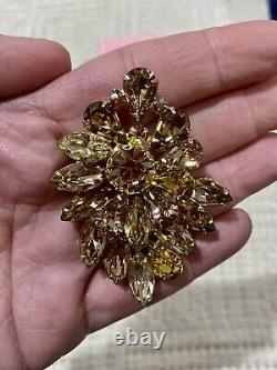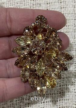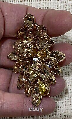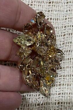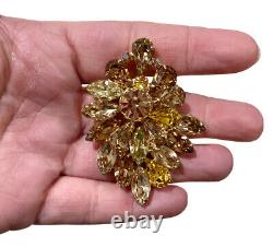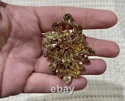 Large gold tone design of Colorado topaz and golden topaz rhinestone navettes as well as pale champagne colored rhinestones and a couple of topaz auroras. The stones are curling over and cascading down and around a large golden topaz rhinestone. Signed'Weiss' on a plaque on the back. Measures 2 3/8" H x 1 7/8" W. Orders are photographed before, during and after packing.