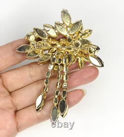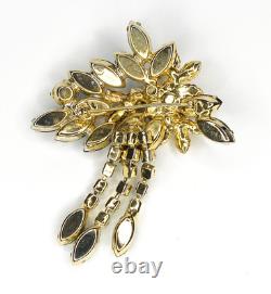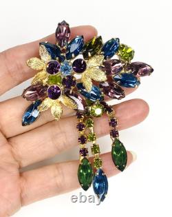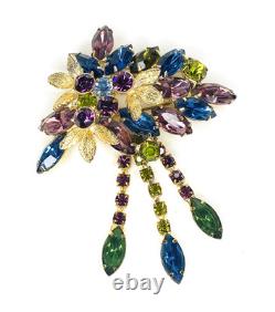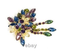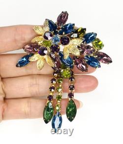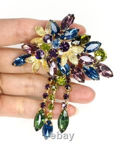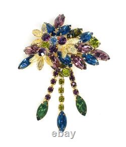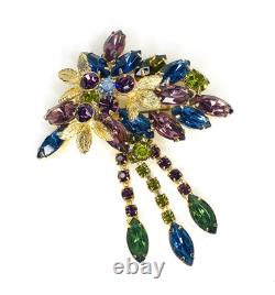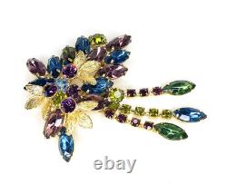 Vintage REGENCY Brooch Blue Purple Green Rhinestone Gold Tone Leaf Dangle Pin. A lovely and unique piece of pin.