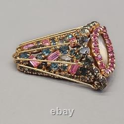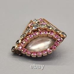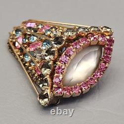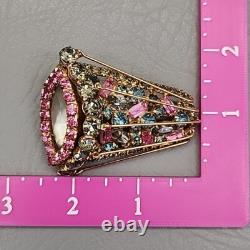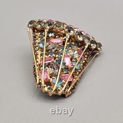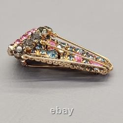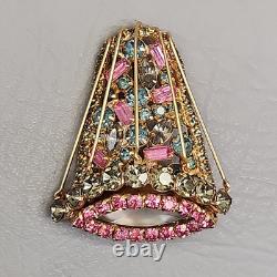 Vintage Rhinestone Bell Brooch Pink Blue Multicolor Wired Quality Unique 2.5. Design: This piece is extra special with this wire overlay and marquise shape rhinestone set inside the underside. It is filled with teal blue, green, and pink rhinestones.