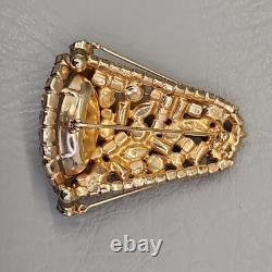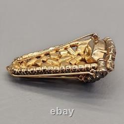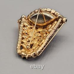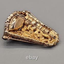 Size: 2.5" T x 2" W. Features: Safety roll clasp on back. Condition: In good used wearable condition. No missing stones and the gold tone looks pretty good. Just pay for your jewelry items all in the same cart. Check back often as we list new items daily!