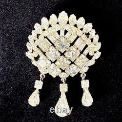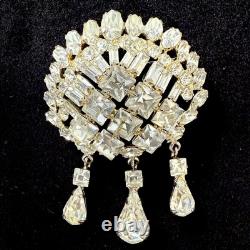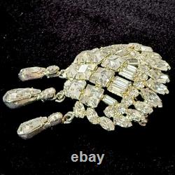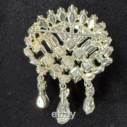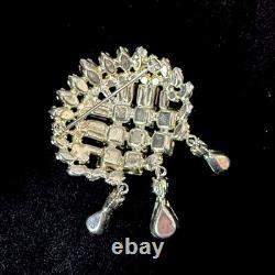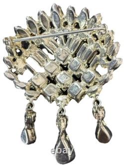 Vintage Stunning and Unique Sparkly Rhinestone Brooch with 3 Pear shaped articulated dangles. Each rhinestone is attached securely by individual prongs to form this beautifully designed Brooch. Beautiful clear sparkling Rhinestones - stunning in person. NOTE: Unbranded - Not marked. Metal: Silver tone with gold-tone prongs. A REAL STUNNER - Clear Icy Rhinestone crystals, an awesome sparkler! PHOTOS ARE PART OF THE DESCRIPTION. NOTE: HAS NOT BEEN CLEANED BY ME.