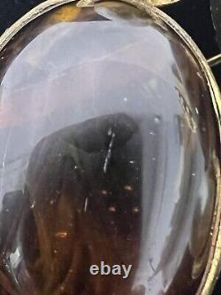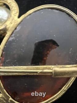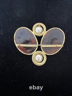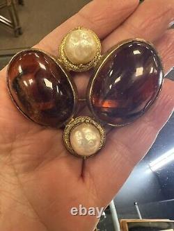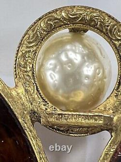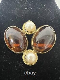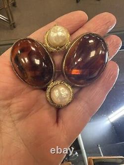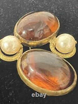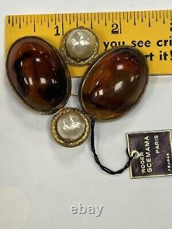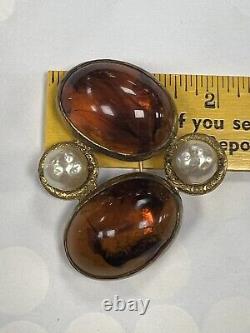 This vintage Roger Scemama brooch is a rare and stunning piece of haute couture jewelry. It features a large amber-colored faux pearl surrounded by glass rhinestones, creating an elegant and sophisticated design. Handmade in France, this brooch showcases a blend of vintage charm and timeless beauty, making it perfect for special occasions like weddings, anniversaries, or as a unique gift for a loved one. There's a hair scratch on the amber stone and a shaved like chip on back. Some discoloration on metal, I think could be cleaned.