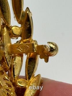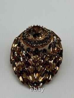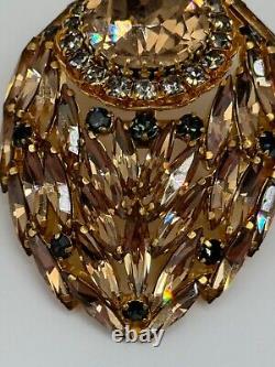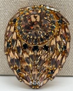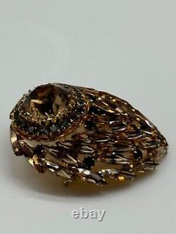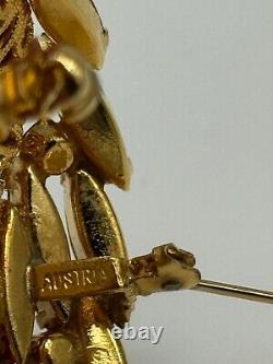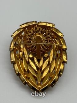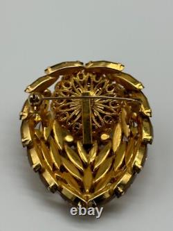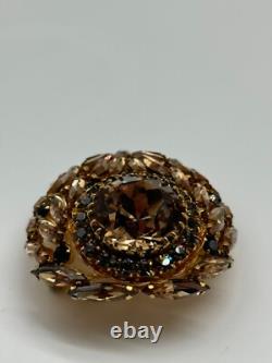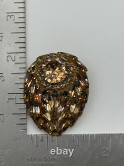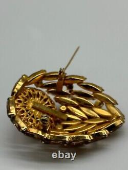 This listing is for a Vintage Schoffel Austria Signed Rhinestone Gold Tone Brooch. The brooch is marked "Austria" and has Schoffel's crown mark. It is in good vintage condition with age/use related wear, there is some cloudiness to the large rhinestone and there is wear to the metal on the back.