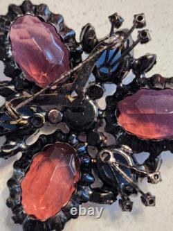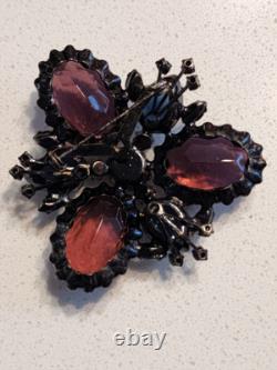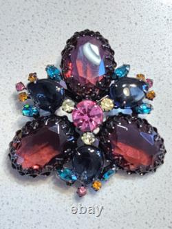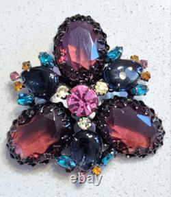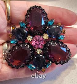 This vintage brooch is designed by the brand Schreiner and features a striking combination of purple, pink, and blue rhinestone, some cabochons, all set in a japanned finish. The multicolor gemstones create a vibrant and eye-catching design that is sure to add a touch of glamour to any outfit.