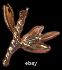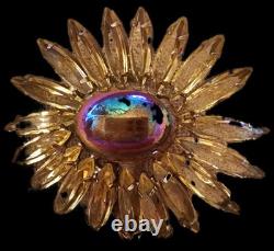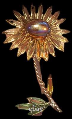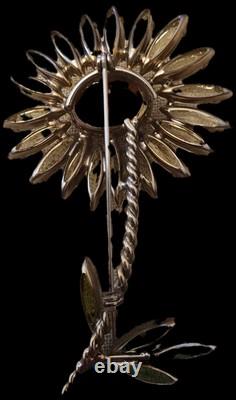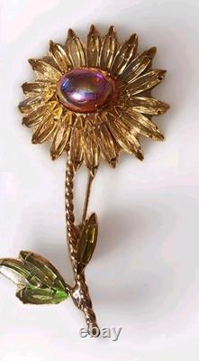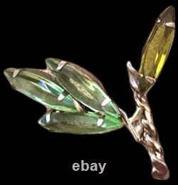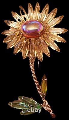 Beautiful unsigned SCHREINER long stem flower brooch. The navettes are a pale yellow/green to clear tones. The center stone is a stunning large cabochon with flexs of pink, orange, and blue colors. The leaves are two tones of green navettes. The pin is in very good condition.