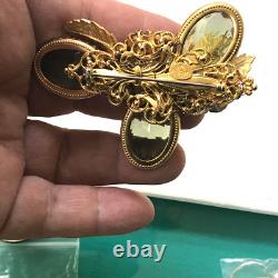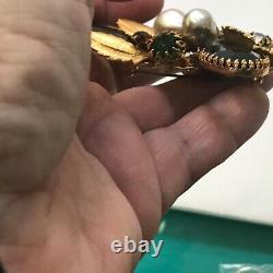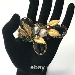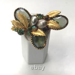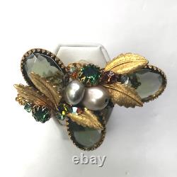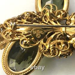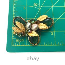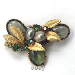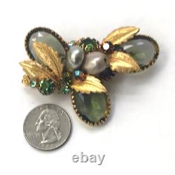 Beautiful wired signed Demario brooch. Featuring large transparent green oval stones, emerald green and ab foiled rhinestones, faux pearls, and goldtone leaves. As true for many vintage wired pieces, there is some movement on a couple of the components.