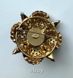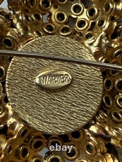 Gorgeous vintage Warner brooch in wonderful condition! This stunning piece is loaded with orange and smoky yellow rhinestones. It measures a full 2 1/4 inches high and has a nice, domed design. The metal is gold tone and the clasp is in great working order. What a truly beautiful find!