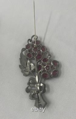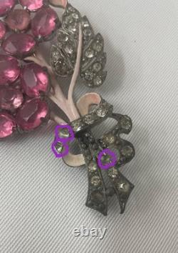 This is a signed Staret brooch. There are three small white rhinestones missing, circled in purple in the photo collage. The brooch is about 4 tall.