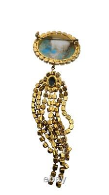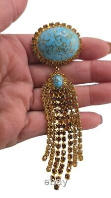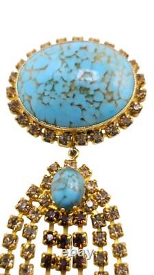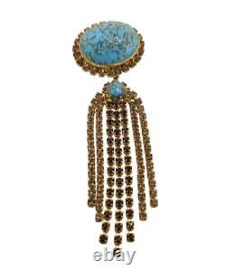 Vintage Turquoise Hubble Glass & Rhinestone Dangle Brooch (A8145) Size: 4.75 Color: Turquoise, Gold Condition: Very good vintage; the pin stem is a little crooked and could use some straighting. Signed: None Details: This vintage brooch features a striking turquoise hubble glass centerpiece, surrounded by shimmering rhinestones with cascading dangles. It's unsigned, very well made, and has light champagne and topaz rhinestone chains. Please look at all the photos, as they are part of the description.