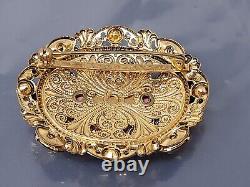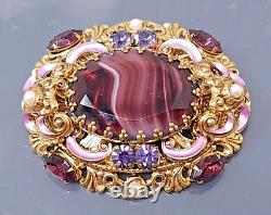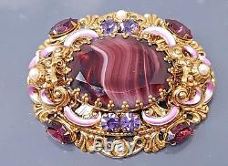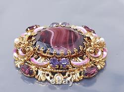 Vintage W Germany Filigree Purple ENAMEL GLASS CABOCHON & RHINESTONE BROOCH. 2 1/4 x 1 3/4 size.