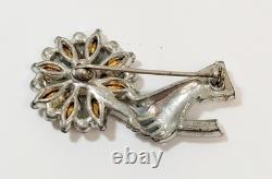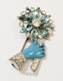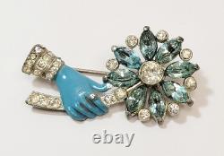 Vtg 1940's Coro Blue Enamel Blue Rhinestone Hand Holding Flower Brooch