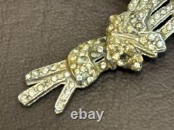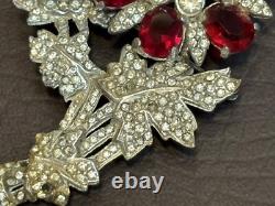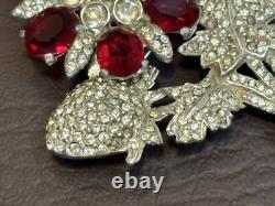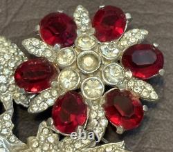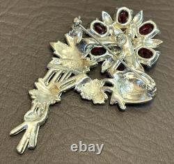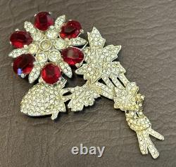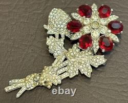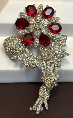 This vintage brooch from the Art Deco era features a beautiful floral design made of red and clear rhinestones. The flower-shaped bouquet is set in pot metal and exudes a classic of the 1930s and 1940s. This original piece of fashion jewelry is perfect for women who appreciate vintage elegance and unique statement accessories.