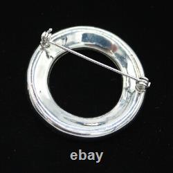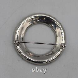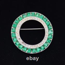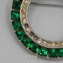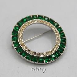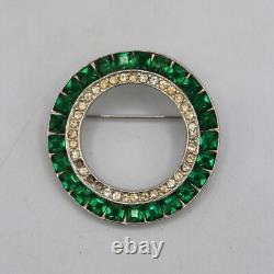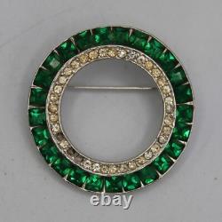 A stunning vintage circle brooch featuring sparkling green channel set rhinestones surrounding a circle of clear rhinestones in silver tone metal. Reverse side features a pin with locking closure and measures 1 1/2 round. 3 missing rhinestones, see photos. Pin is unsigned but in the style of trifari.