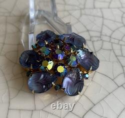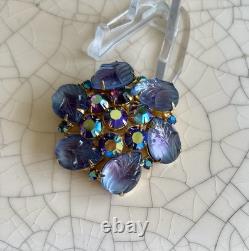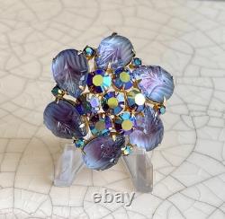 Vtg Large Molded Glass Leaf Smoke Purples Rhinestone Iridescent Brooch Pin 2